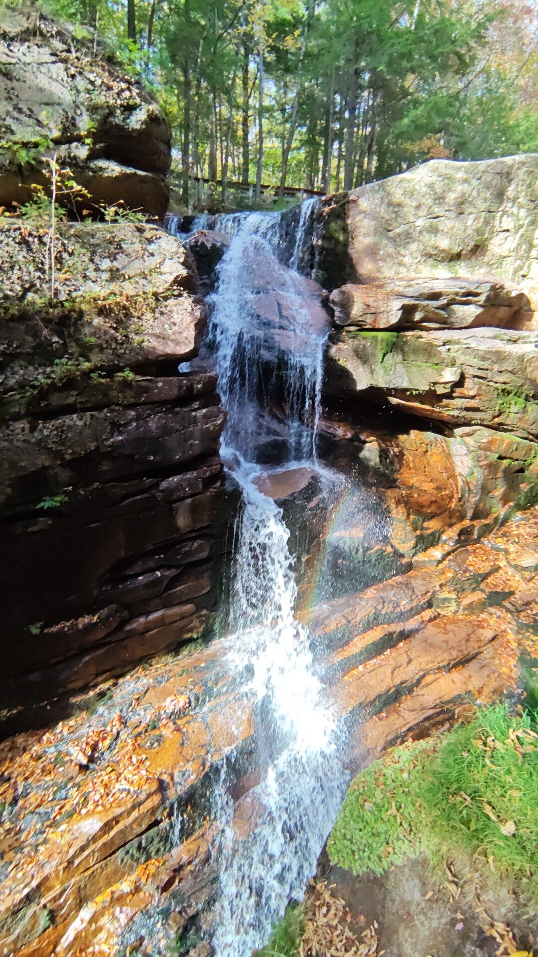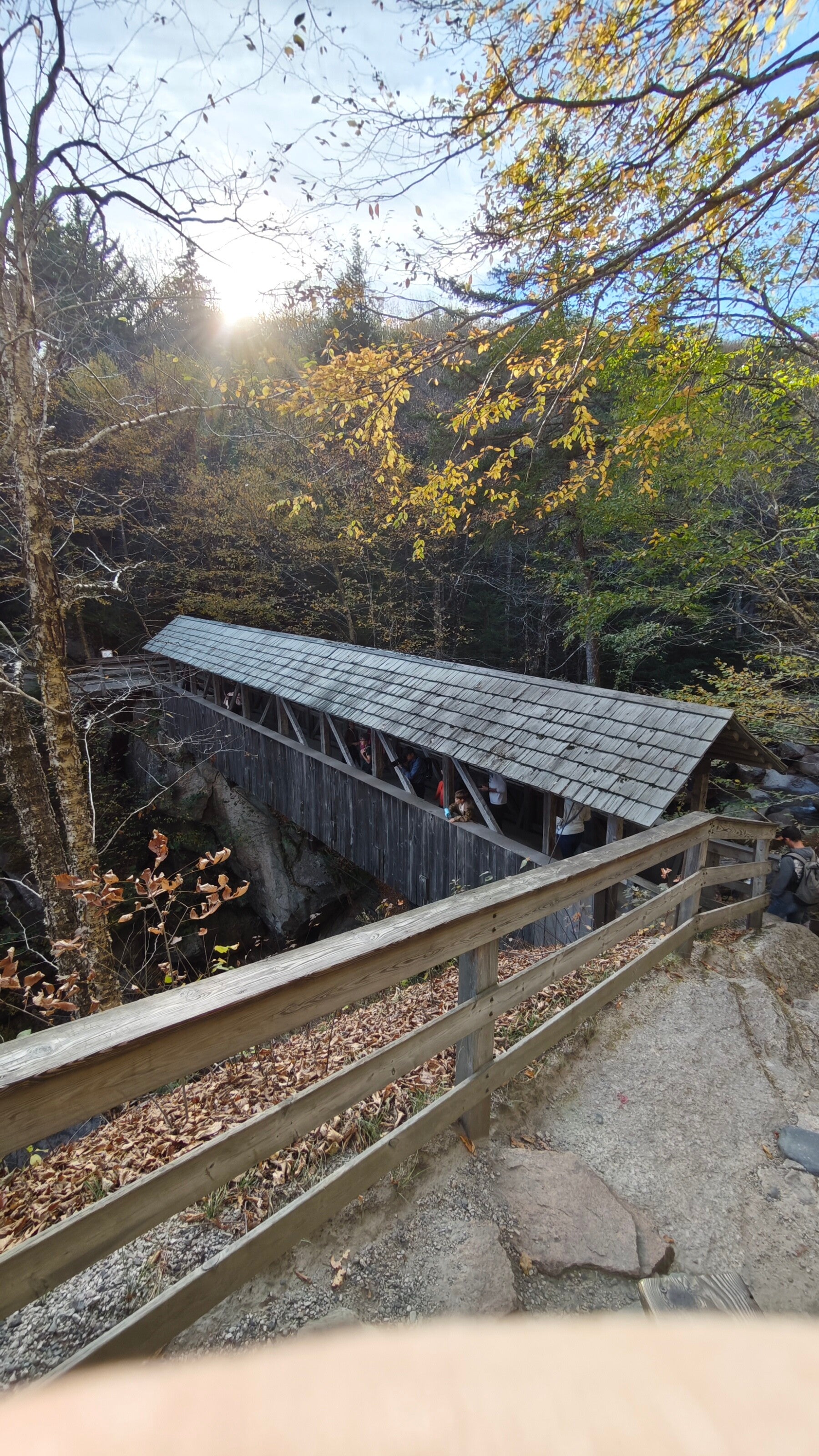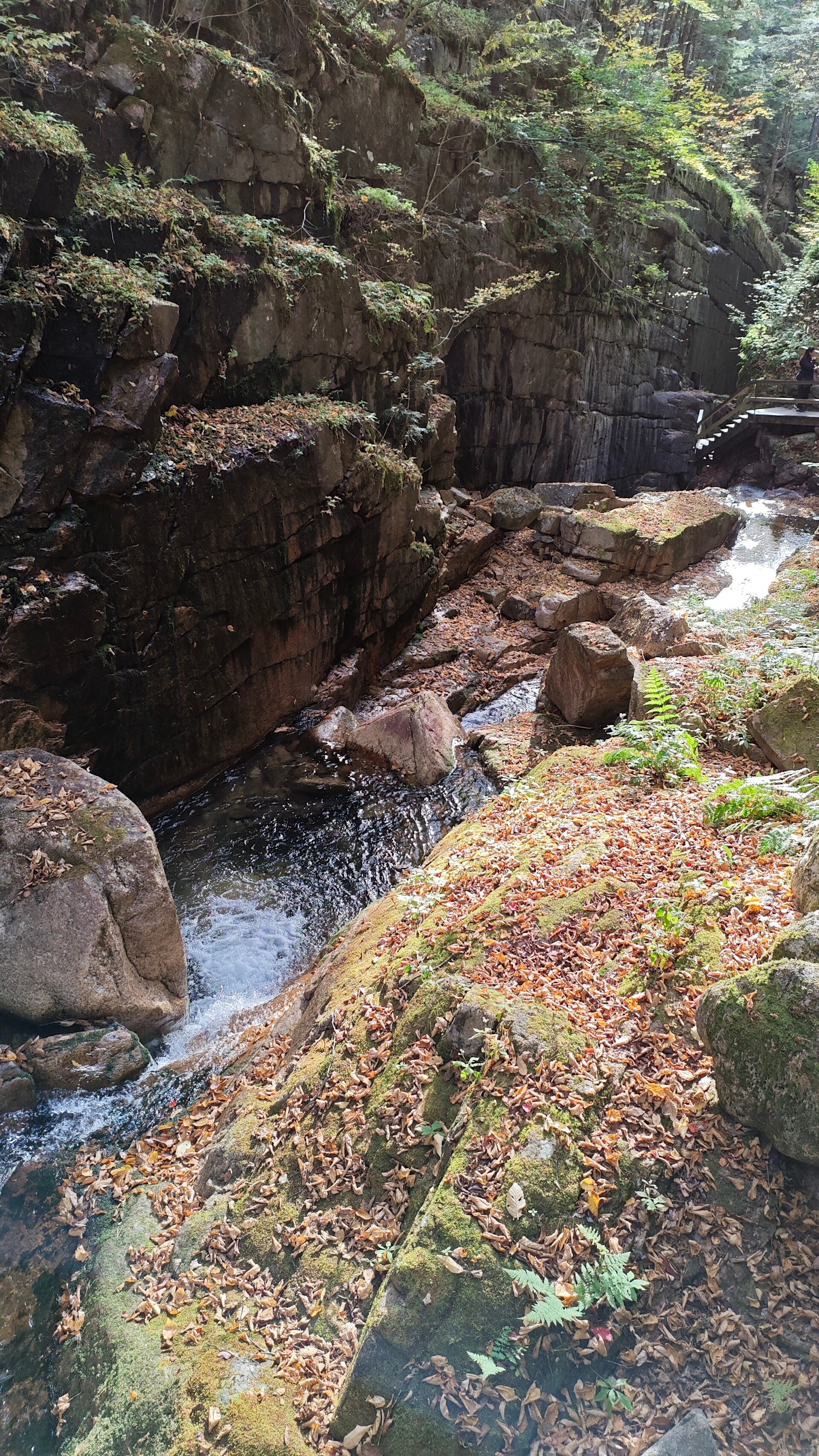Am Nachmittag erreichten wir die Flume Gorge im White Mountain National Forest. Gegen halb vier konnten wir direkt durchgehen, keine Wartezeit, ideales Wetter. Die Wanderung dauerte etwa anderthalb Stunden und führte über Holzstege und schmale Wege durch eine eindrucksvolle Schlucht. Bis zu 27 Meter hohe Granitwände, rauschendes Wasser, moosbewachsene Felsen und der Herbstwald in allen Farben, ein Erlebnis, das uns sprachlos machte 🌿💦