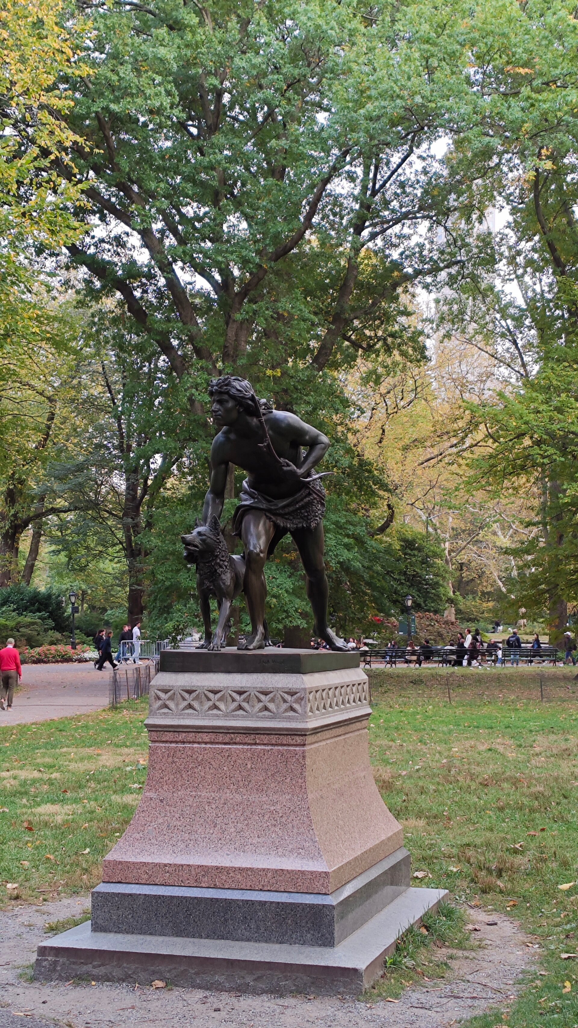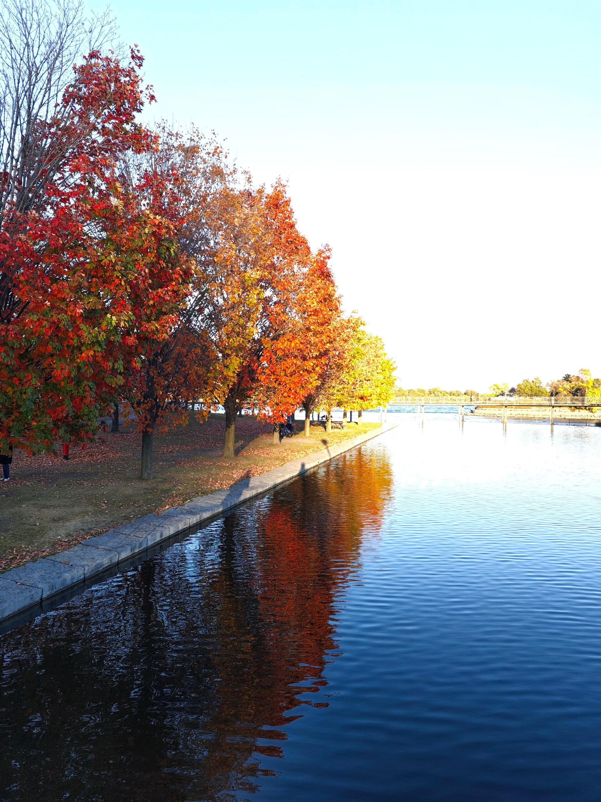 Ein Stück weiter flatterte die amerikanische Flagge zwischen goldenen Blättern 🇺🇸🍁 während ein Eichhörnchen neugierig über den Weg huschte. Die Sonne stand tief, das Licht wurde weich, golden. Wir liefen bis zur Bow Bridge, sahen Boote auf dem Wasser, hörten Musik und Stimmen im Hintergrund.