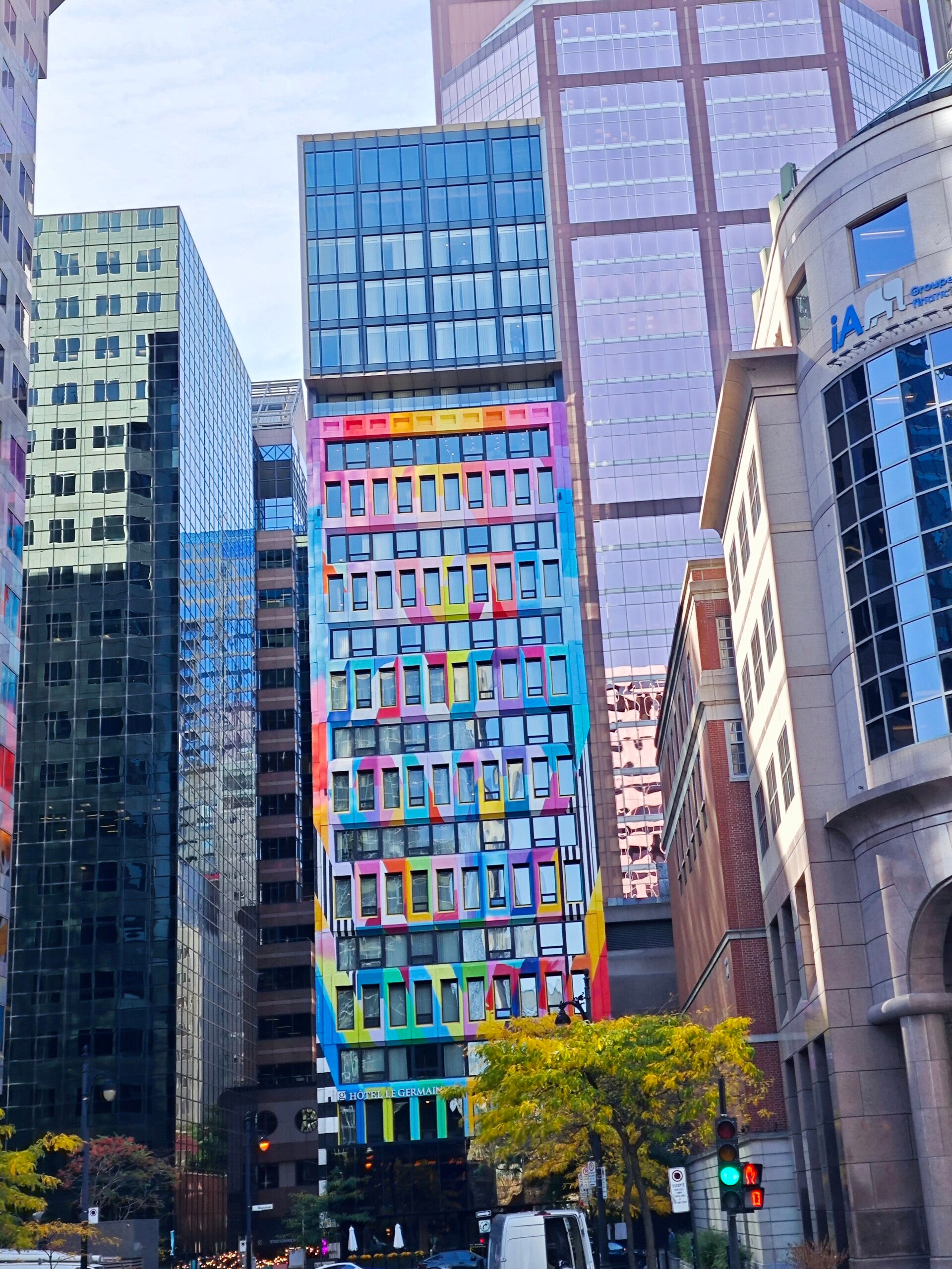 Der Bus fuhr gemächlich durch Montréal. Breite Boulevards, alte Steinhäuser, Parks, Kunst, Leben. Bei jedem Halt veränderte sich das Bild der Stadt. Besonders eindrucksvoll war Station acht, der Aussichtspunkt auf dem Mont Royal. Von dort blickt man über die gesamte Stadt, die Türme der Innenstadt, den Sankt Lorenz Strom und das leuchtende Herbstlaub. Die Farben wirkten fast überirdisch. Ein Ort, an dem man unweigerlich still wird 🍁
