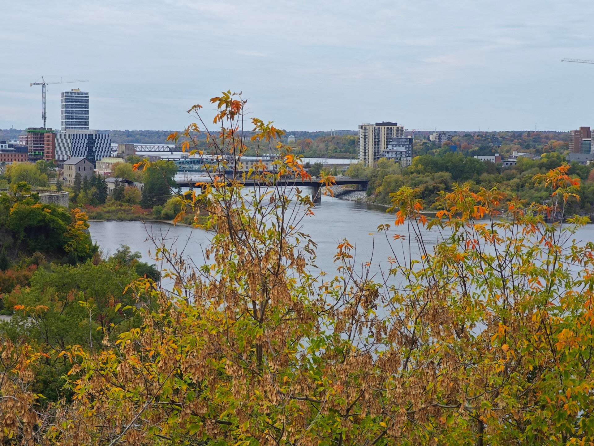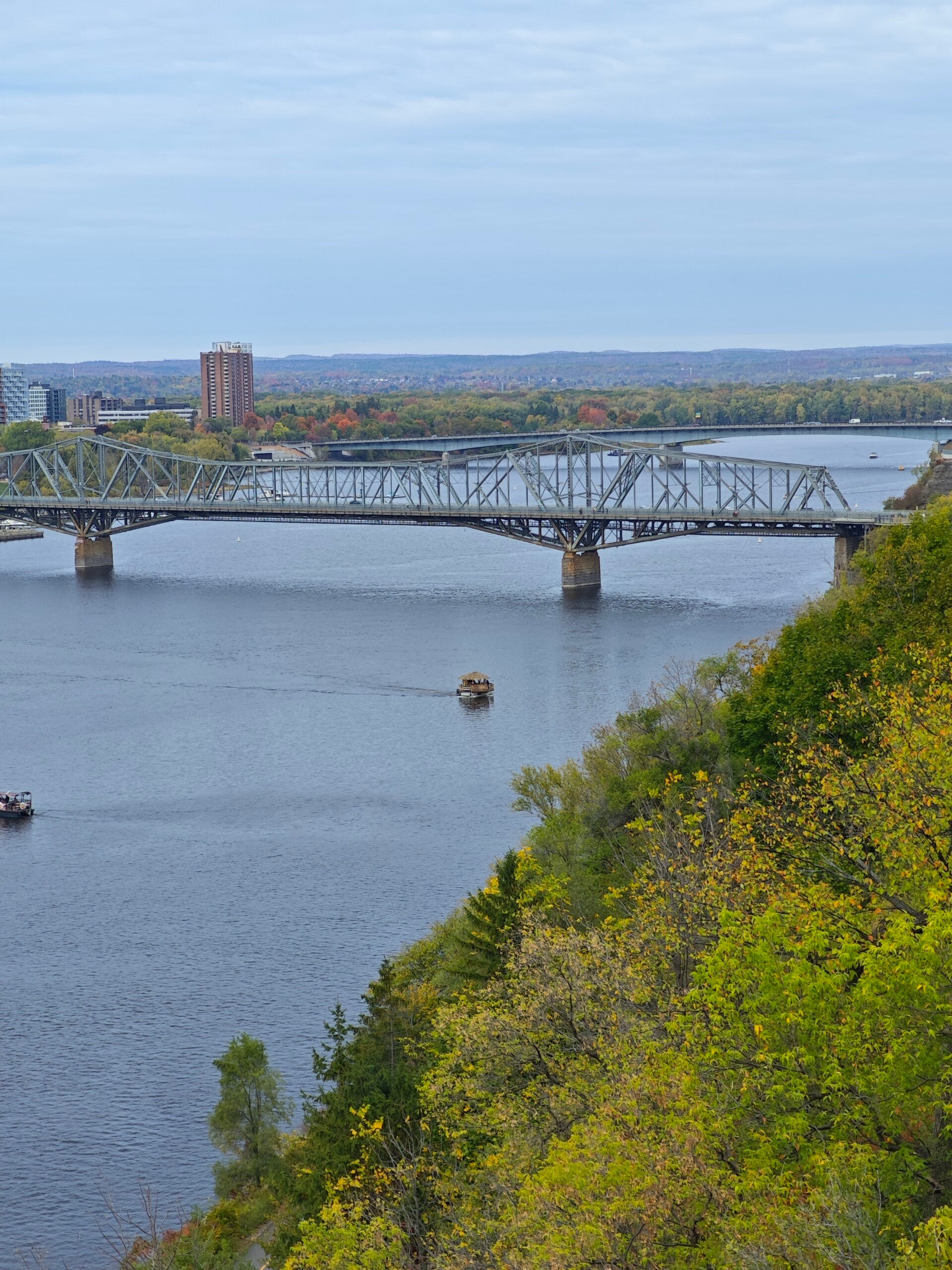 Später standen wir am Aussichtspunkt über dem Ottawa River. Unten glitt ein Boot vorbei, über uns spannte sich die Alexandra Bridge, die Ontario und Québec verbindet. Das Licht über dem Wasser war golden, ruhig und weit.