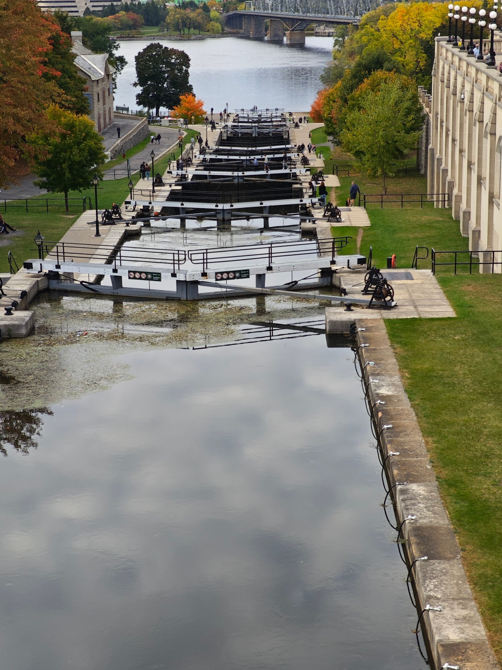 Ein paar Schritte weiter der Rideau Canal, ein technisches Meisterwerk des 19. Jahrhunderts und UNESCO Welterbe. Acht Schleusenkammern überwinden auf rund 24 Metern den Höhenunterschied zwischen Fluss und Stadt. Noch heute werden sie von Hand bedient, mit Kurbeln und Zahnrädern, wie vor fast zweihundert Jahren. Wir sahen zu, wie ein Kajakfahrer sich Stufe für Stufe hinab arbeiten ließ, ruhig und präzise. Dahinter das helle, turmgesäumte Château Laurier, das die ganze Szene wirken ließ wie ein Gemälde aus einer anderen Zeit.