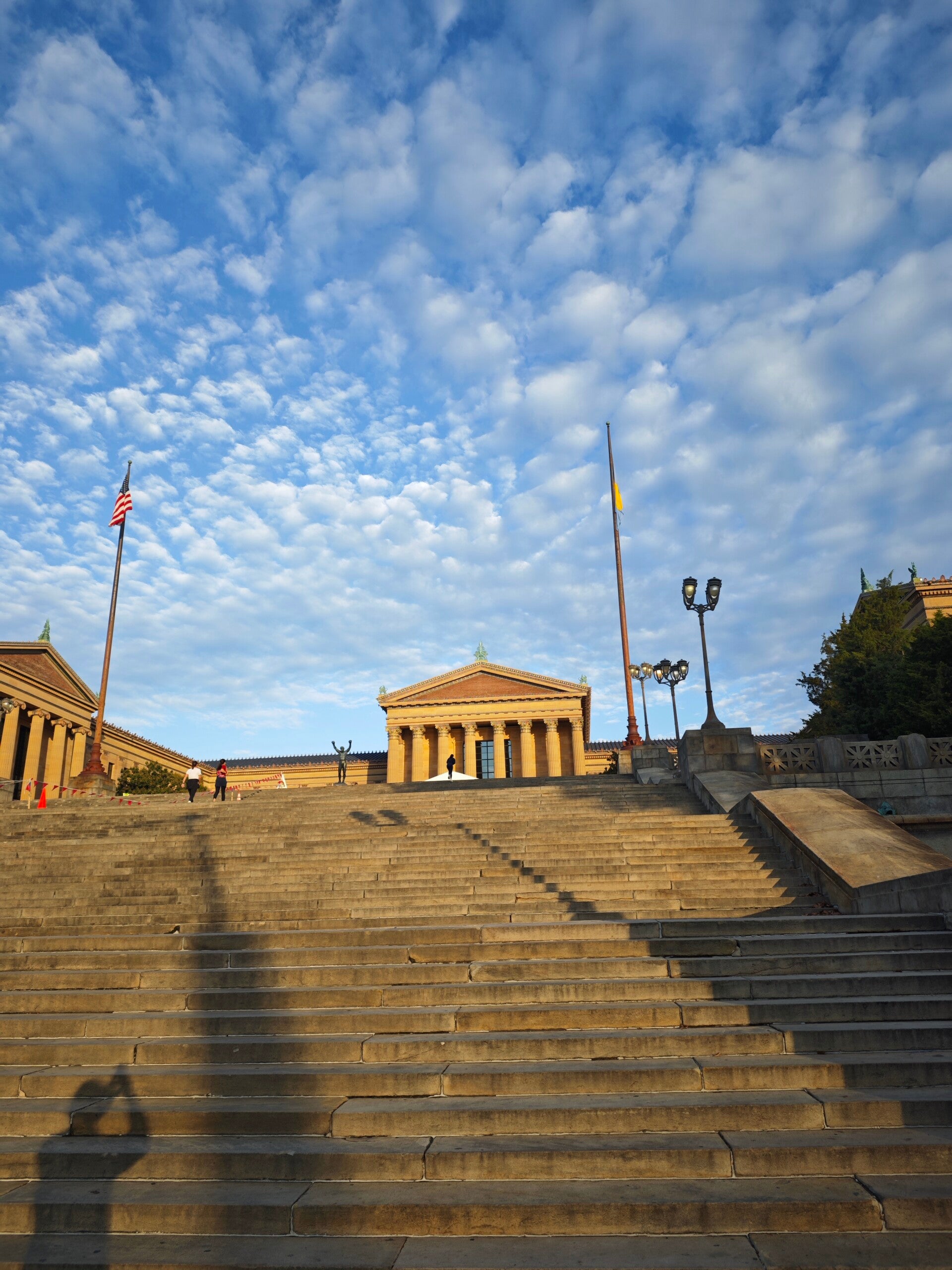 Unser Spaziergang führte uns zum Philadelphia Museum of Art. Die berühmten Stufen hinauf, oben der Blick über die Stadt, weit und klar. Die Statue von Rocky, umringt von Besuchern, die alle lächeln. Von dort weiter über den Benjamin Franklin Parkway mit den Flaggen der Nationen bis zum Rodin Museum, wo der Denker still im Garten sitzt 🏛️