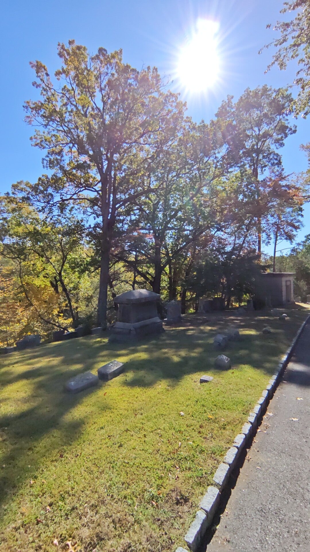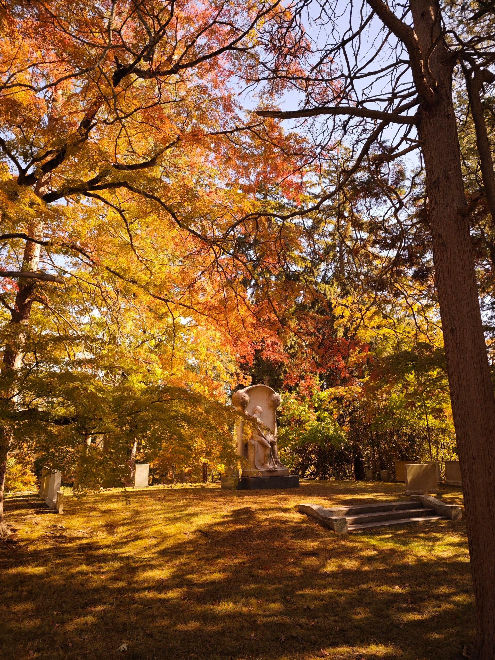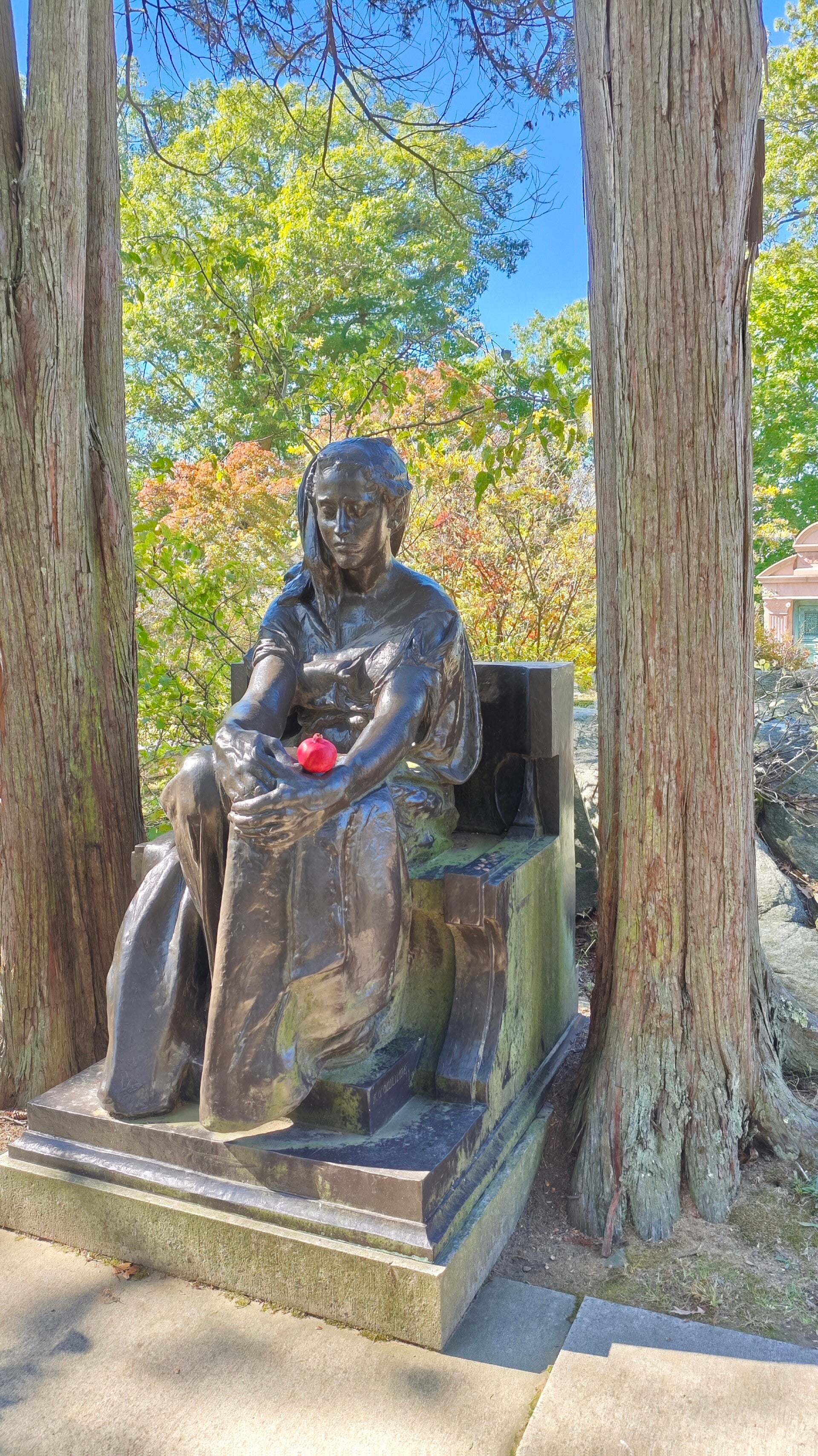 Der Friedhof von Sleepy Hollow ist riesig, fast wie ein Park. Alte Bäume, gewundene Wege, Grabsteine, die sich neigen, als wollten sie zuhören. Dazwischen steht das Rockefeller Mausoleum, ein mächtiger Bau aus hellem Granit. Davor die bronzene Frau in Trauerhaltung, die Mourning Woman. Sie steht dort seit über hundert Jahren und bewacht schweigend die Ruhestätten.