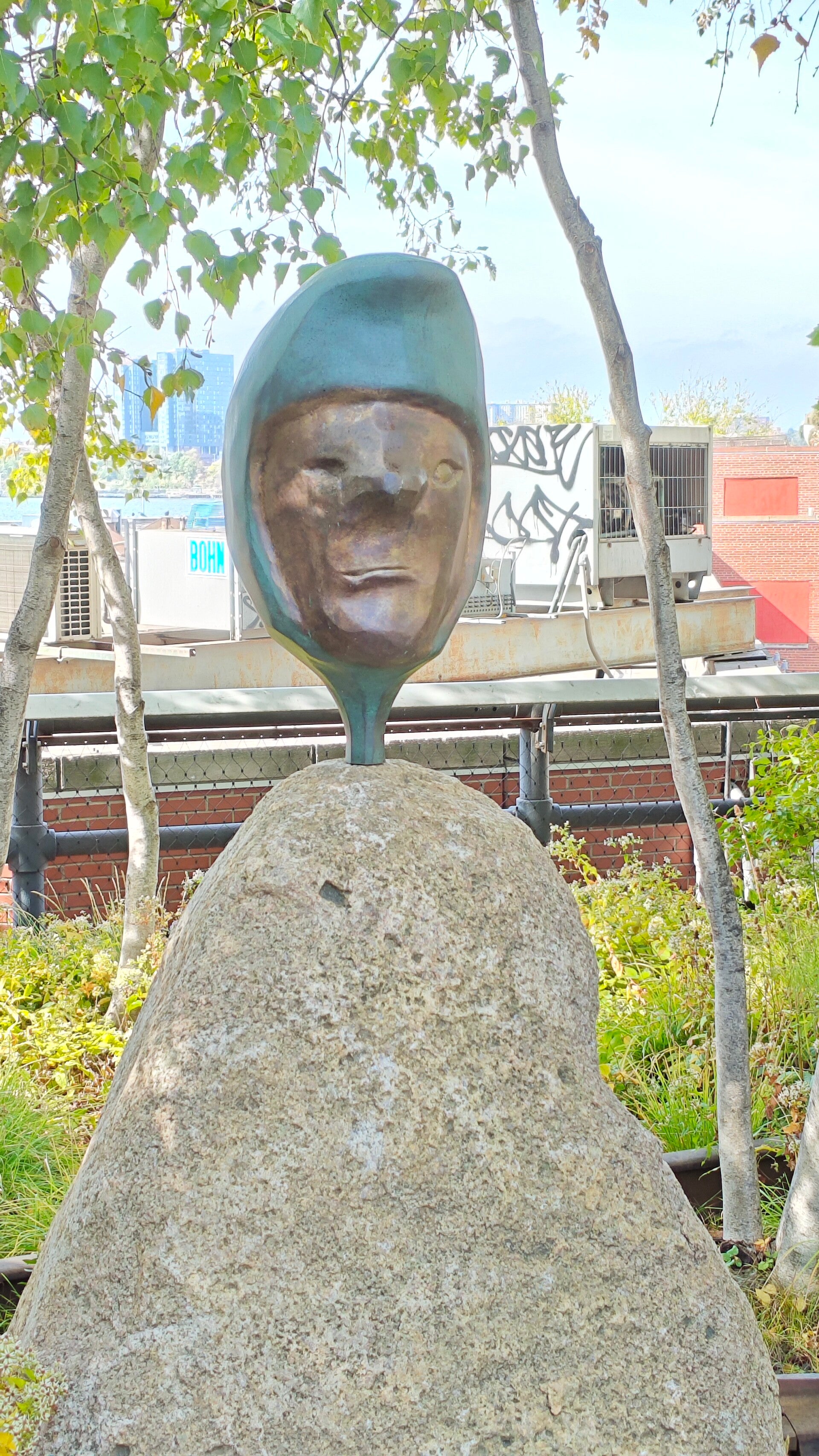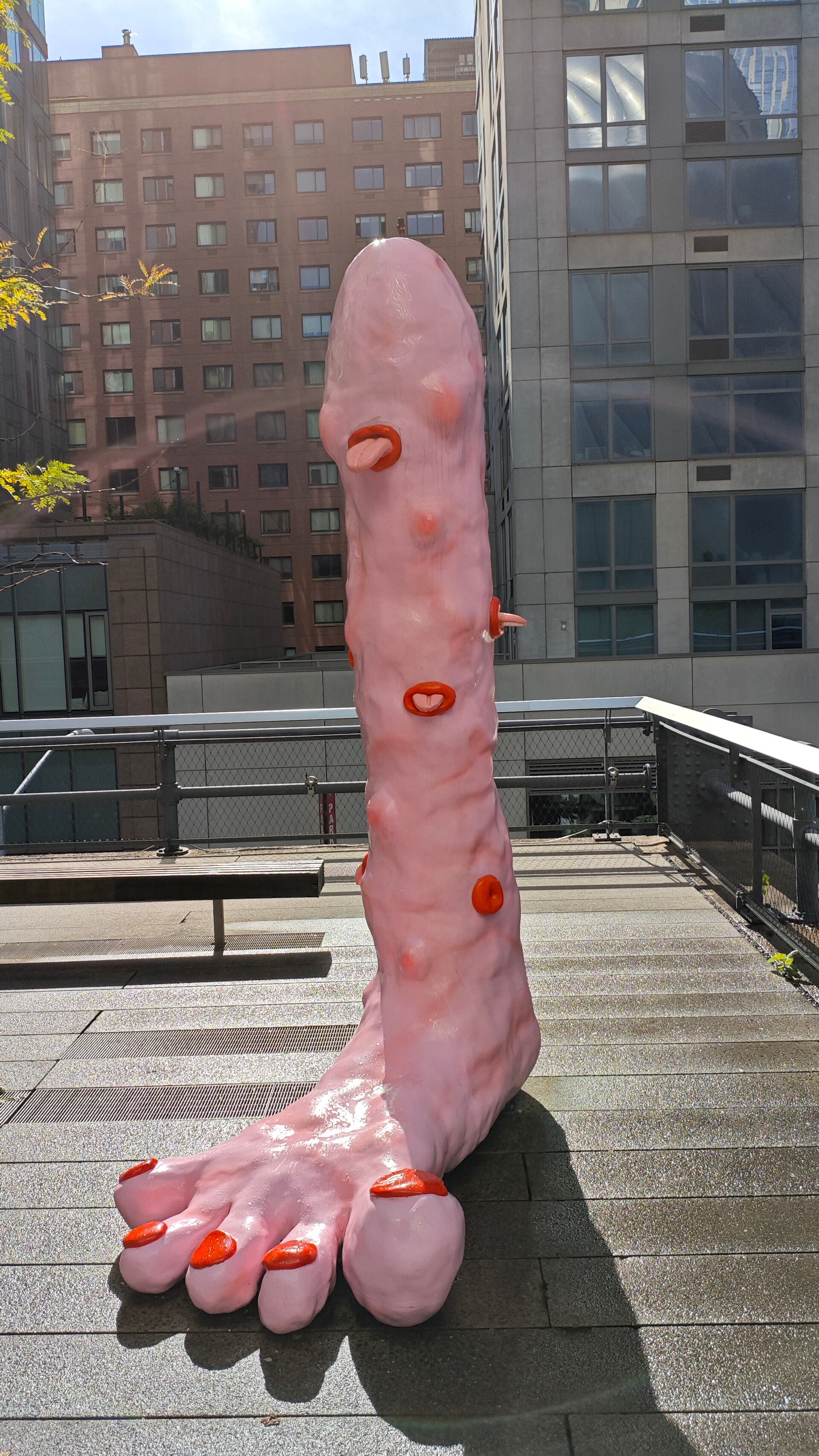 Zwischen dem Grün tauchten überall Kunstwerke auf: ein bronzenes Gesicht, ruhig auf einem Stein, als Wächter der High Line. Eine überdimensionale rosa Fußskulptur mit roten Zehennägeln, frech und charmant 💗👣 Und eine gelbe Figur mit großen Augen, die neugierig über eine Mauer blickte. Die High Line ist nicht perfekt gepflegt, sondern bewusst wild, Pflanzen dürfen hier wachsen, wie sie wollen 🌸