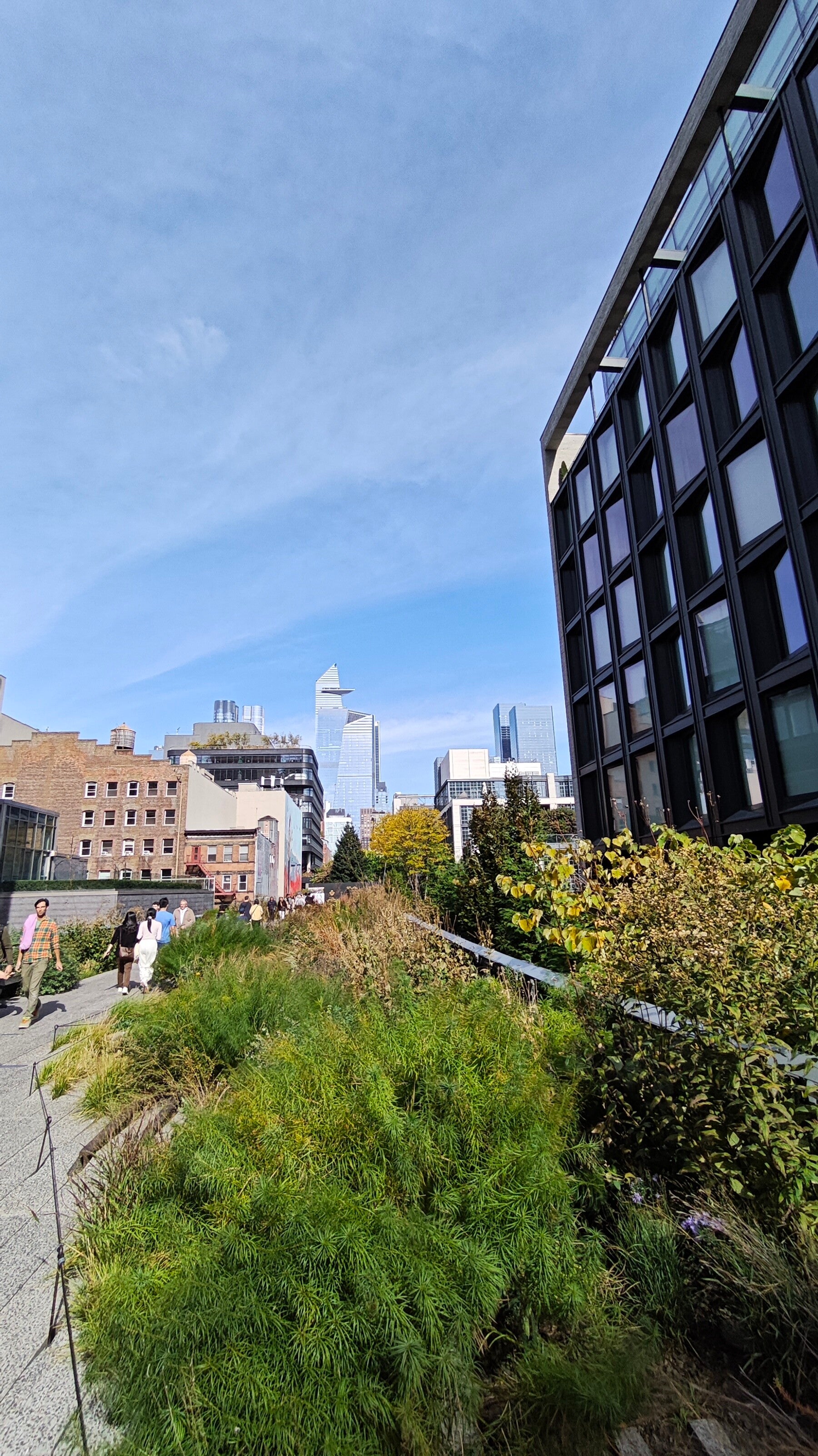 Der Einstieg lag zwischen alten Lagerhäusern, und kaum waren wir oben, veränderte sich die Stimmung. Zwischen den Schienen wuchsen Gräser und Astern, die Herbstfarben leuchteten, und die Stadt klang gedämpft, nur ein Rauschen von unten, vermischt mit Vogelstimmen und Gesprächen. Es war, als liefe man durch ein stilles, schwebendes Stück New York 🍂